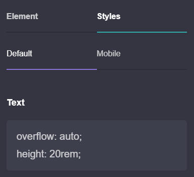To create the scrolling effect, we’ll add custom CSS in the Style settings:1. Set the Box Height – Define a height to limit the text area. This must be smaller than the total height that the text reaches to, or else the scrollbar will not appear. For example, If the content in the text reaches 5rem in height, you must define the height less than 5rem.2. Enable Scrolling – Use overflow: auto to allow scrolling within the box.3. Add Custom Styling (optional) – You can add styling such as borders or background color to enhance the look.