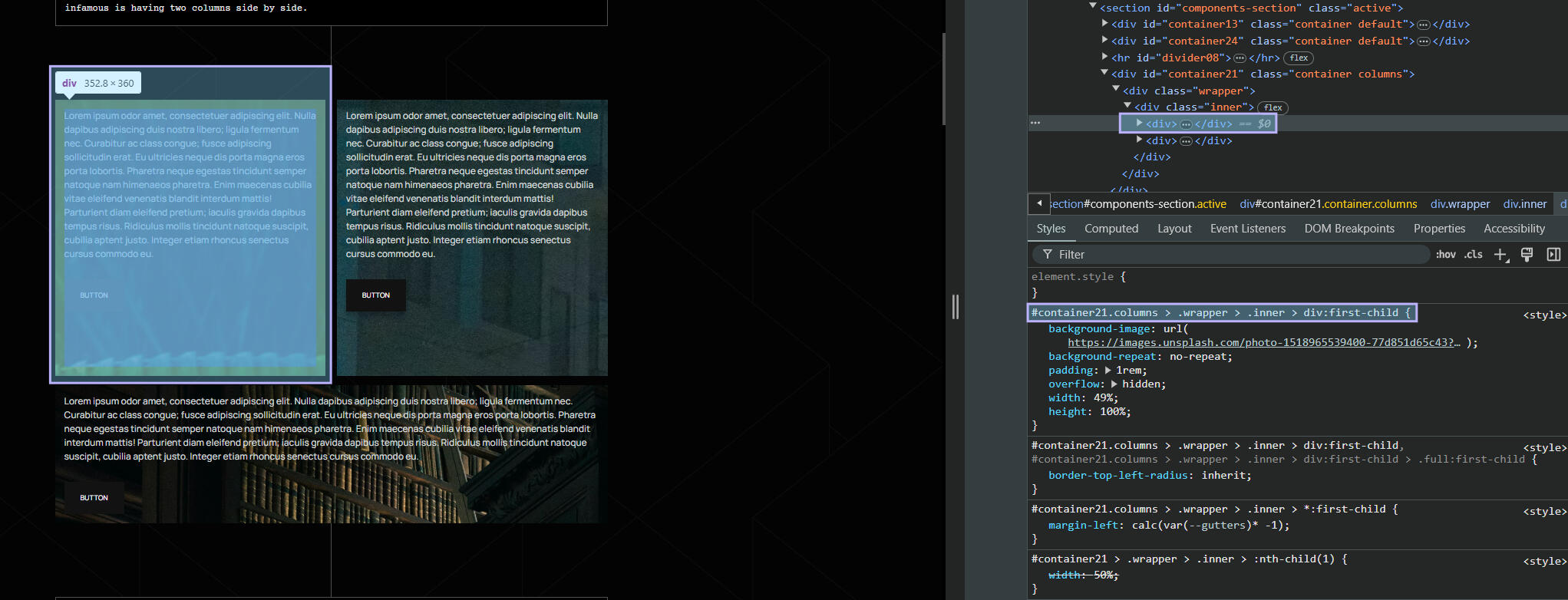So, to recap:Containers = the big boxColumns = div blocks inside of the big boxWhile these div blocks are not the containers we hoped for, they can be styled with custom CSS code to look like they are containers.